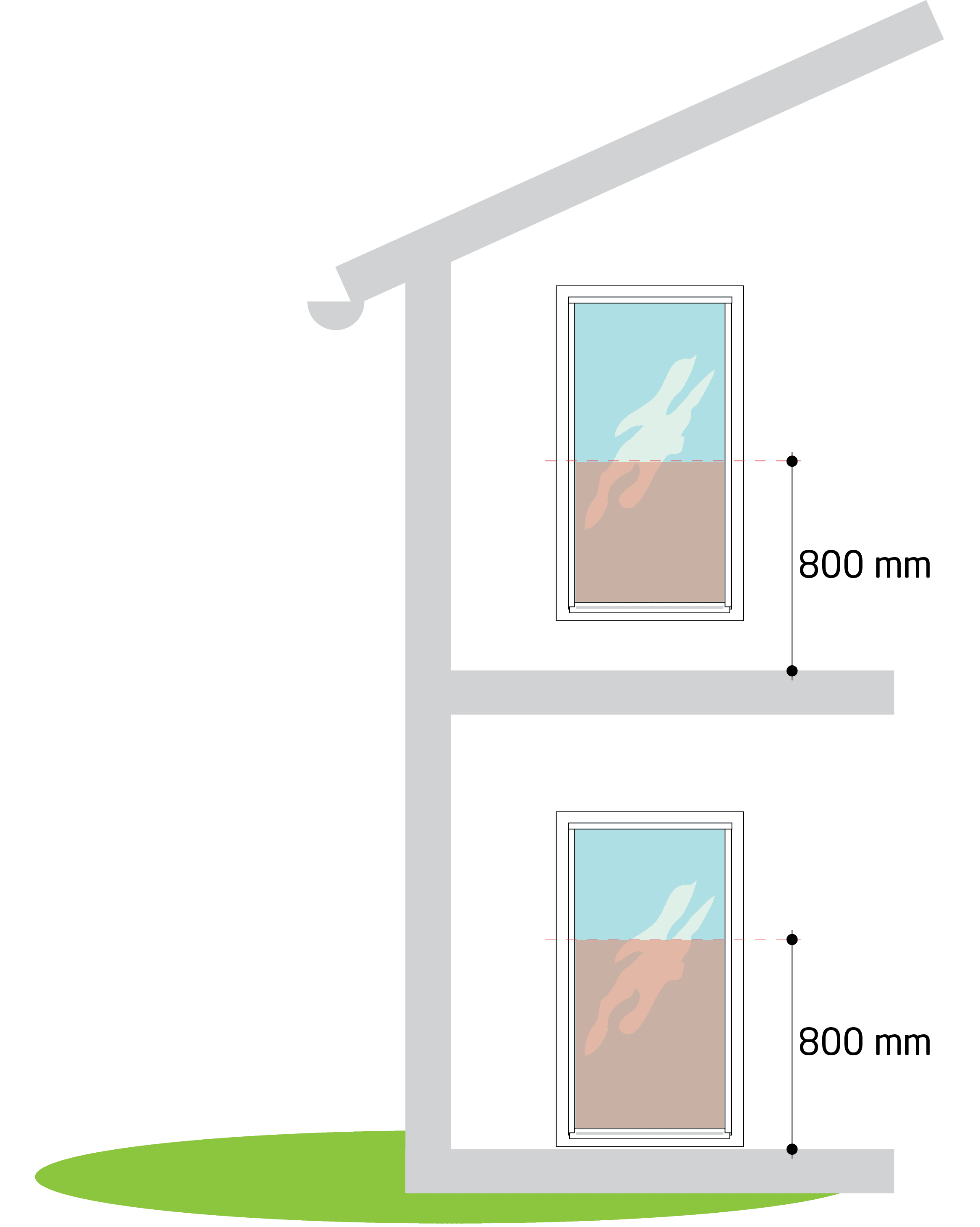 Glas lägre än 800 mm skall vara laminerat eller härdat in och utvändigt. Mått uk glas till golv/mark lägre än 800mm.